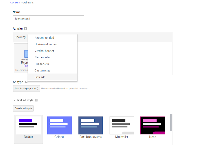 4. Beri nama unit iklan sesuai keinginan, dan jangan lupa ganti jenis iklannya menjadi iklan tautan / Link Ads.